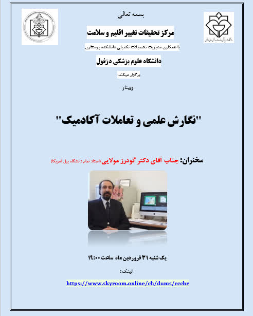مرکز تحقیقات تغییر اقلیم و سلامت دانشگاه علوم پزشکی دزفول، با افتخار برگزاری اولین وبینار بهاره از سری رویدادهای علمی خود در سال ۱۴۰۴ را اعلام میکند. این وبینار تخصصی با موضوع »نگارش علمی و تعاملات آکادمیک« در تاریخ ۳۱ فروردین ۱۴۰۴، ساعت ۱۹ به صورت آنلاین میزبان علاقهمندان، پژوهشگران و اعضای هیئت علمی بود.