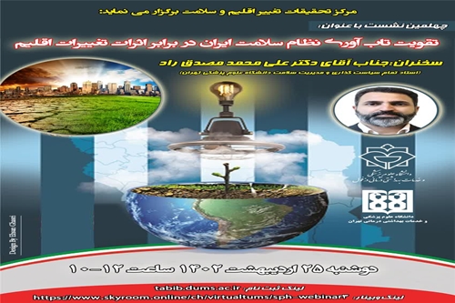 بدینوسیله از کلیه علاقمندان، اساتید، محققان و دانشجویان دعوت بعمل می آید تا در چهلمین نشست از مجموع جلسات ماهیانه گفت و شنود با عنوان " *تقویت تاب آوری نظام سلامت ایران در برابر اثرات تغییر اقلیم * " با سخنرانی " *جناب آقای دکتر محمد علی مصدق راد* " استاد تمام سیاست گذاری و مدیریت سلامت دانشگاه علوم پزشکی تهران شرکت بفرمایید. این نشست به همت مرکز تحقیقات تغییر اقلیم و سلامت مشترک دانشگاه علوم پزشکی دزفول و دانشگاه علوم پزشکی تهران و دپارتمان سلامت در حوادث و بلایای دانشکده بهداشت دانشگاه علوم پزشکی تهران در تاریخ دوشنبه 25 اردیبهشت 1402 راس ساعت 10 الی 12 برگزار خواهد شد. نشست به صورت مجازی برگزار خواهد شد
