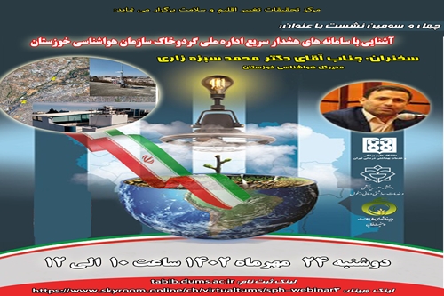 بدینوسیله از کلیه علاقمندان، اساتید، محققان و دانشجویان دعوت بعمل می آید تا در چهل و سومین نشست از مجموع جلسات ماهیانه گفت و شنود مرکز تحقیقات تغییر اقلیم و سلامت با عنوان " *آشنایی با سامانه های هشدار سریع اداره ملی گرد و خاک سازمان هواشناسی خوزستان* " با سخنرانی " *آقای دکتر محمد سبزه زاری * " مدیر کل هواشناسی خوزستان شرکت بفرمایید. این نشست به همت مرکز تحقیقات تغییر اقلیم و سلامت و دپارتمان سلامت در حوادث و بلایای دانشگاه علوم پزشکی تهران و دانشگاه علوم پزشکی دزفول در تاریخ دوشنبه 24 مهر 1402 راس ساعت 10 الی 12 برگزار خواهد شد. نشست به صورت مجازی برگزار خواهد شد. ثبت نام در وب سایتhttp://tabib.dums.ac.ir انجام خواهد شد و برای حضور در جلسه روی لینک زیر کلیک بفرمایید و از گزینه میهمان وارد شوید.