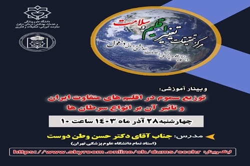مرکز تحقیقات تغییرات اقلیم و سلامت دانشگاه علوم پزشکی دزفول با افتخار اعلام می‌دارد که وبینار پاییزه در تاریخ ۲۸ آذرماه ۱۴۰۳، از ساعت ۱۰ صبح برگزار گردید. موضوع این وبینار"توزیع سموم در اقلیم‌های متفاوت ایران و تأثیر آن بر انواع سرطان‌ها"بود. مدرس این دوره، جناب آقای دکتر حسن وطن‌دوست، استاد تمام دانشگاه علوم پزشکی تهران، به بررسی تأثیر استفاده بی‌رویه از سموم بر شیوع سرطان و توزیع سموم در استان‌های مختلف ایران پرداخت. این نشست به‌عنوان یک فرصت ارزشمند برای تبادل نظر و افزایش آگاهی در زمینه تأثیرات زیست‌محیطی بر سلامت عمومی محسوب می‌شود و امید است که با برگزاری این‌گونه رویدادها، گامی مؤثر در راستای ارتقای سلامت جامعه برداریم.