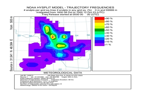 پیشبینی مسیر حرکت ذرات و آلاینده ها در فضا و زمان با استفاده از داده های ماهواره ای(استان خوزستان) پیشبینی 8اکتبر(16 مهر) تا 12 اکتبر(20مهر) سال 1402